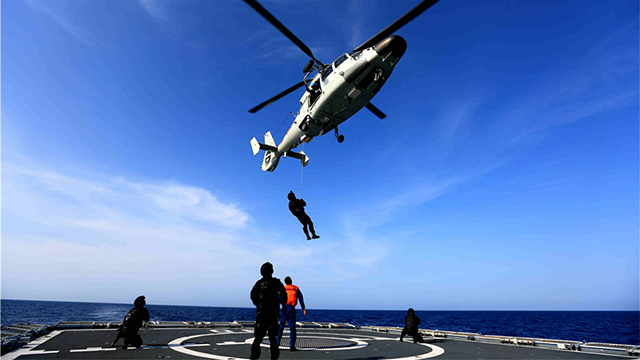 当地时间6月24日上午,正在执行第1151批护航任务的海军第二十九批护航编队徐州舰,在亚丁湾西部海域协同被护商船组织特战队员武力营救被劫商船演练。