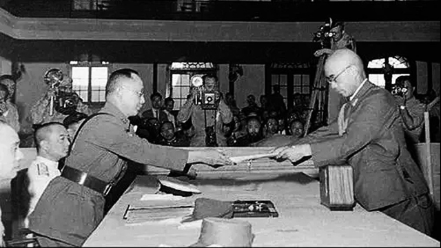 1945年8月14日,日本照会中、苏、美、英四国,表示接受《波茨坦公告》,无条件投降。
