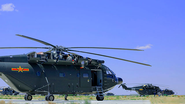 在外驻训的第80集团军某陆航旅机务官兵,顶着烈日和风沙对直升机进行维护保养。